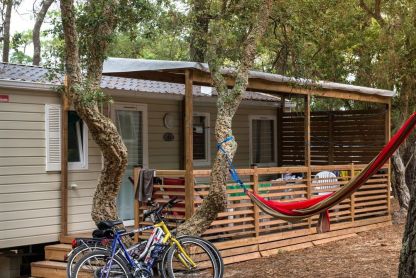 • Mobil-home 3/6 pers. - env. 30 m² : séjour avec coin cuisine équipé et canapé-lit 2 places, chambre avec 1 lit double, chambre avec 2 lits simples. Sanitaires complets. Chauffage et climatisation. Terrasse couverte avec salon de jardin et transats.
