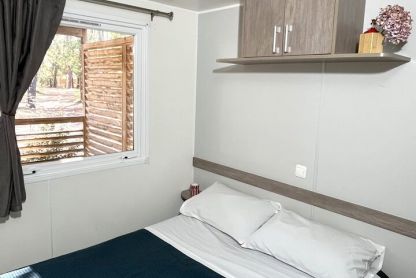 • Mobil-home 4/6 pers. - env. 31 m² : séjour avec coin cuisine équipé, chambre avec 1 lit double, 2 chambres avec chacune 2 lits simples. Sanitaires complets. Chauffage et climatisation. Terrasse couverte avec salon de jardin et transats.