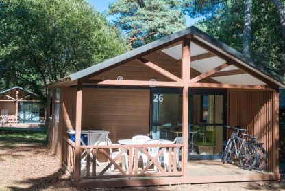 • Chalet 2/4 pers. - env. 25 m² : séjour avec coin cuisine équipé, chambre avec 1 lit double, chambre avec 2 lits simples. Sanitaires complets. Chauffage. Terrasse couverte avec salon de jardin.