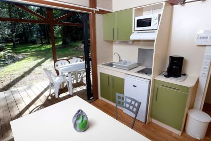 • Chalet 2/4 pers. PMR - env. 35 m² : séjour avec coin cuisine équipé, chambre avec 1 lit double surélevé PMR, chambre avec 2 lits simples. Chauffage. Terrasse couverte avec salon de jardin. Rampe d’accès PMR. PMR : logement accessible aux personnes à mobilité réduite.