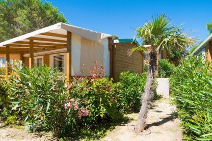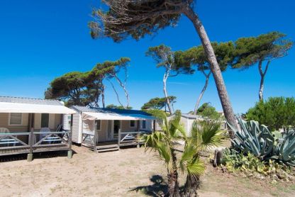 • Mobil-home 3/6 pers. - env. 25 m² : séjour avec coin cuisine équipé, TV et canapé-lit 2 places (pour 1 adulte ou 2 enfants de -12 ans), chambre avec 1 lit double, chambre avec 2 lits simples. Climatisation. Terrasse couverte avec salon de jardin et transats.