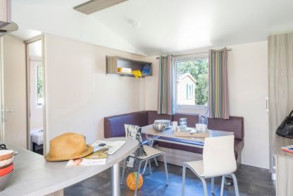 • Mobil-home 3/6 pers. - env. 27 m² : séjour avec coin cuisine équipé et canapé-lit 2 places (pour 1 adulte ou 2 enfants de -12 ans), chambre avec 1 lit double, chambre avec 2 lits simples. Chauffage. Terrasse couverte avec salon de jardin et transats.