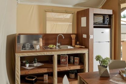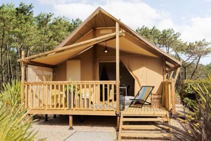 • Lodge 2/4 pers. - env. 25 m² : séjour avec coin cuisine équipé, chambre avec 1 lit double (160), chambre avec 2 lits simples. Sanitaires complets. Terrasse couverte avec salon de jardin. Habitat en bois et toile pour une expérience originale.
