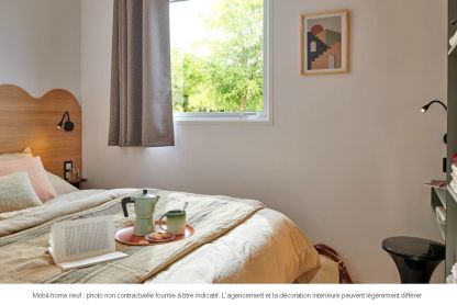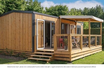 • Mobil-home 4/6 pers. - env. 29 m² : séjour avec coin cuisine équipé et canapé convertible 2 places, chambre avec 1 lit double, chambre avec 2 lits simples. Terrasse semi-ouverte avec salon de jardin.