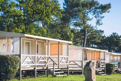 • Mobil-home 3/6 pers. - env. 27 m² : séjour avec coin cuisine équipé et canapé-lit 2 places, chambre avec 1 lit double, chambre avec 2 lits simples. Sanitaires complets. Chauffage. Terrasse couverte avec salon de jardin et 2 transats.
