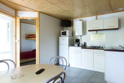 • Mobil-home 4/6 pers. - env. 49 m² : séjour avec coin cuisine équipé, chambre avec 1 lit double, 2 chambres avec chacune 2 lits simples. Climatisation et TV. Terrasse couverte avec salon de jardin.