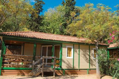 • Chalet 3/6 pers. - env. 50 m² : séjour avec coin cuisine équipé et couche d’appoint 1 place, chambre avec 1 lit double, chambre avec 2 lits superposés et 1 lit simple. Climatisation et TV. Terrasse couverte avec salon de jardin en bois.