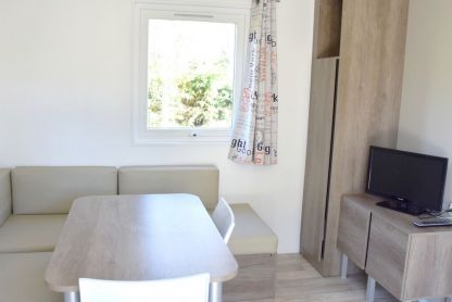 • Cottage Family 4 pers. - env. 28 m² : séjour avec coin cuisine équipé (lave-vaisselle inclus) et TV, chambre avec 1 lit double, chambre avec 2 lits simples. Terrasse en bois avec salon de jardin.