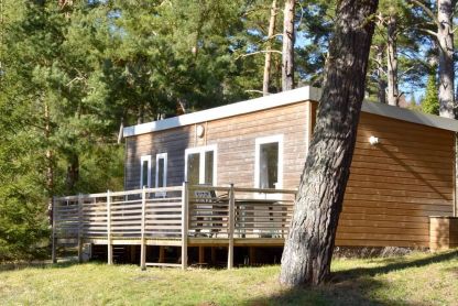 • Chalet 4 pers. - env. 25 m² : séjour avec coin cuisine équipé et canapé-lit 2 places, chambre avec 2 lits superposés. Terrasse avec salon de jardin.