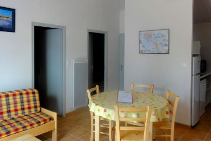 • Villa 5/6 pers. : séjour avec coin cuisine équipé, TV et canapé convertible 1 place, 1 chambre avec 1 lit double, 1 chambre avec 3 lits simples. Jardin privatif avec salon de jardin et barbecue individuel.