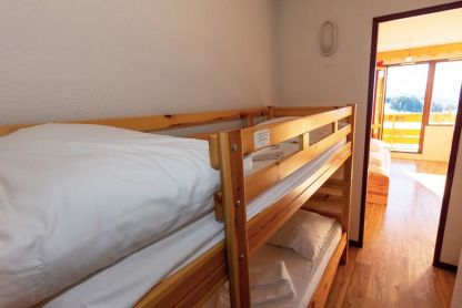 • Appartement 4/6 pers. - env. 36 m² : séjour avec coin cuisine équipé, TV et 1 lit gigogne 2 places, chambre avec 1 lit double, coin nuit avec 2 lits superposés. Balcon. Une armoire à skis attribuée à chaque logement.