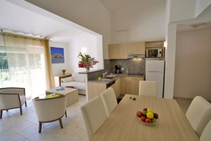 • Mini villa 8/10 pers. - env. 80 m² : séjour avec coin cuisine équipé (lave-vaisselle inclus) et canapé-lit 2 places. À l’étage, 2 chambres avec chacune 2 lits simples, chambre avec 2 lits superposés et 1 lit double ou 2 lits simples. Climatisation. Terrasse avec salon de jardin.