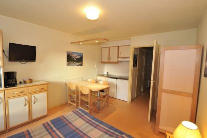 • Studio 3/4 pers. - env. 25 m2 : séjour avec coin cuisine équipé (avec lave-vaisselle) et canapé-lit 2 places, coin montagne avec 2 lits superposés. TV et Wi-Fi. Balcon. Ajout d’un lit bébé possible.