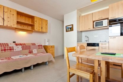 • Appartement 2 pièces + coin montagne - 6 pers. - env. 32 m² : séjour avec coin cuisine équipé (lave-vaisselle inclus) et canapé-lit 2 places, chambre avec 2 lits superposés, coin nuit avec 2 lits superposés. Balcon couvert avec salon de jardin. Ajout d’un lit bébé possible.