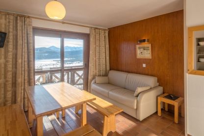 • Appartement 4 pers. - env. 35 m² : séjour avec coin cuisine équipé (lave-vaisselle inclus) et canapé-lit 2 places (160 cm), chambre avec 2 lits simples. TV et Wi-Fi. Balcon orienté sud avec vue sur la vallée. Ajout d’un lit bébé possible.