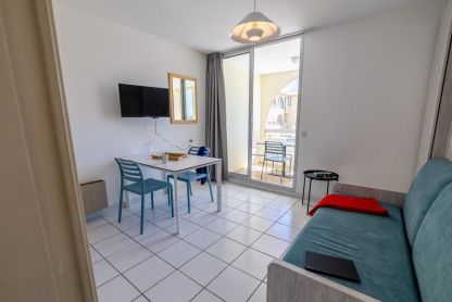 • Studio 4 pers. - env. 21 m² : séjour avec coin cuisine équipé (lave-vaisselle inclus) et lit double escamotable, coin nuit avec 2 lits superposés. TV et Wi-Fi. Balcon avec salon de jardin. Ajout d’un lit bébé impossible.