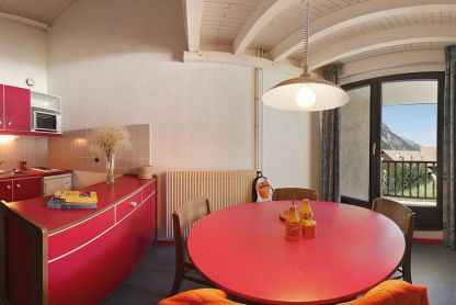 • Appartement duplex 5 pers. - env. 41 m² : au rez-de-chaussée, séjour avec coin cuisine équipé et 1 lit simple. TV et balcon. À l’étage, chambre avec 1 lit double, chambre avec 2 lits simples. Accueil de 2 lits bébé possible.