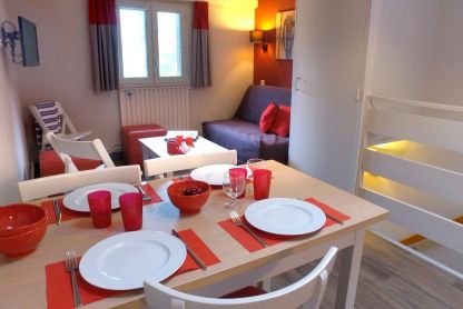 • Appartement 5 pers. - env. 30 m² : entrée au rez-de-chaussée, chambre avec 2 lits superposés et 1 lit simple. Au 1er étage, séjour avec coin cuisine équipé (lave-vaisselle inclus) et TV, canapé-lit 2 places et salle d’eau. Ajout d’un lit bébé possible.
