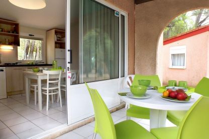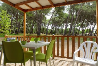 • Habitat nature 5 pers. - env. 27 m² : séjour avec coin cuisine équipé (lave-vaisselle inclus) et banquette-lit 1 place, chambre avec 1 lit double, chambre avec 2 lits simples. TV. Terrasse semi-couverte avec salon de jardin. Ajout d’un lit bébé possible.