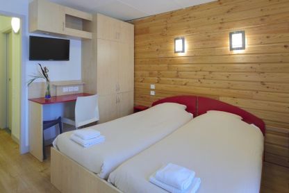 • Appartement 5 pers. - env. 35 m² : séjour avec coin cuisine équipé (lave-vaisselle inclus), 2 lits jumeaux et 1 lit en hauteur, chambre avec 2 lits jumeaux. TV et Wi-Fi.