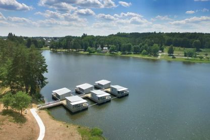 • Chalet flottant 5 pers. - env. 29 m² : séjour avec coin cuisine équipé et canapé-lit 2 places, chambre avec 1 lit double (160 cm), chambre avec 2 lits superposés et 1 lit gigogne. Terrasse avec salon de jardin. Ajout d’un lit bébé impossible.