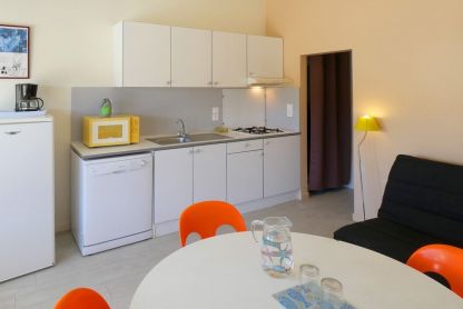 • Gîte 6 pers. - env. 37 m² : séjour avec coin cuisine équipé (lave-vaisselle inclus) et canapé-lit 2 places ou 2 lits gigognes, chambre avec 1 lit double, chambre avec 2 lits superposés. TV et Wi-Fi. Terrasse avec salon de jardin.