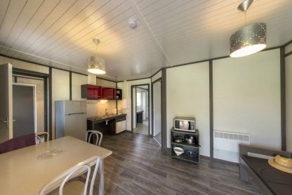 • Chalet 6 pers. - env. 30 m² : séjour avec coin cuisine équipé (lave-vaisselle inclus), chambre avec 1 lit double, chambre avec 2 lits simples, chambre avec 2 lits superposés. TV et Wi-Fi. Terrasse couverte avec salon de jardin.