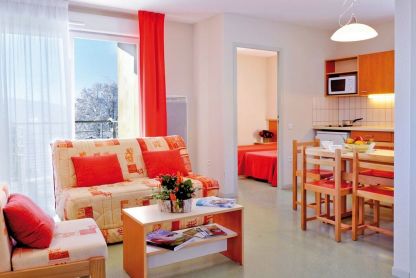 • Appartement 4 pers. - env. 36 m² : séjour avec coin cuisine équipé, TV et canapé-lit gigogne, chambre avec 2 lits simples. Terrasse ou balcon avec salon de jardin, exposition sud et vue sur le lac. PMR : 1 appartement accessible aux personnes à mobilité réduite.