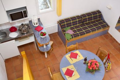 • Chalet 5/6 pers. - env. 38 m² : séjour avec coin cuisine équipé et avec banquette-lit 1 place, chambre avec 2 lits superposés et 1 lit simple, mezzanine avec 1 lit double. Terrasse couverte avec salon de jardin. PMR : 4 chalets sont accessibles aux personnes à mobilité réduite.