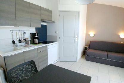 • Studio 2 pers. PMR - env. 19 m² : séjour avec coin cuisine équipé, 1 lit double ou 2 lits jumeaux. Salle d’eau. Terrasse avec salon de jardin. PMR : studio accessible aux personnes à mobilité réduite.