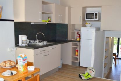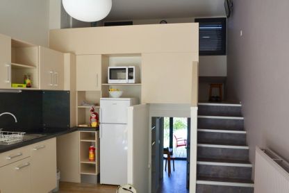 • Gite 5 pers. - env. 36 m² : au rez-de-chaussée, séjour avec coin cuisine équipé et TV, terrasse avec salon de jardin. Au 1er étage, chambre avec 2 lits superposés et 1 lit simple, salle d’eau. Au 2ème étage, mezzanine ouverte avec 1 lit double. Ajout d’un lit bébé possible.