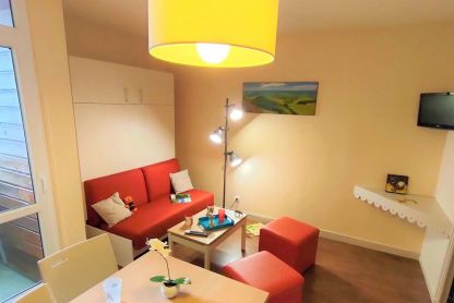 • Appartement 4 pers. PMR - env. 35 m² : séjour avec coin cuisine équipé et 1 lit armoire double, chambre avec 2 lits superposés. TV et petit balcon couvert. Accueil d’un lit bébé possible. PMR : logement accessible aux personnes à mobilité réduite.